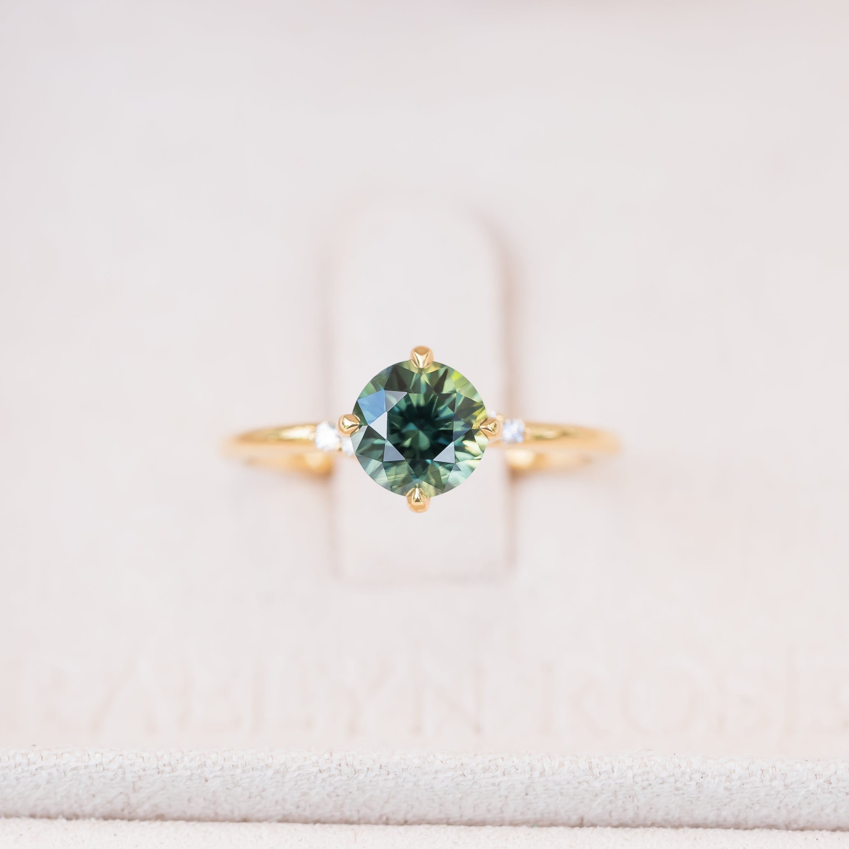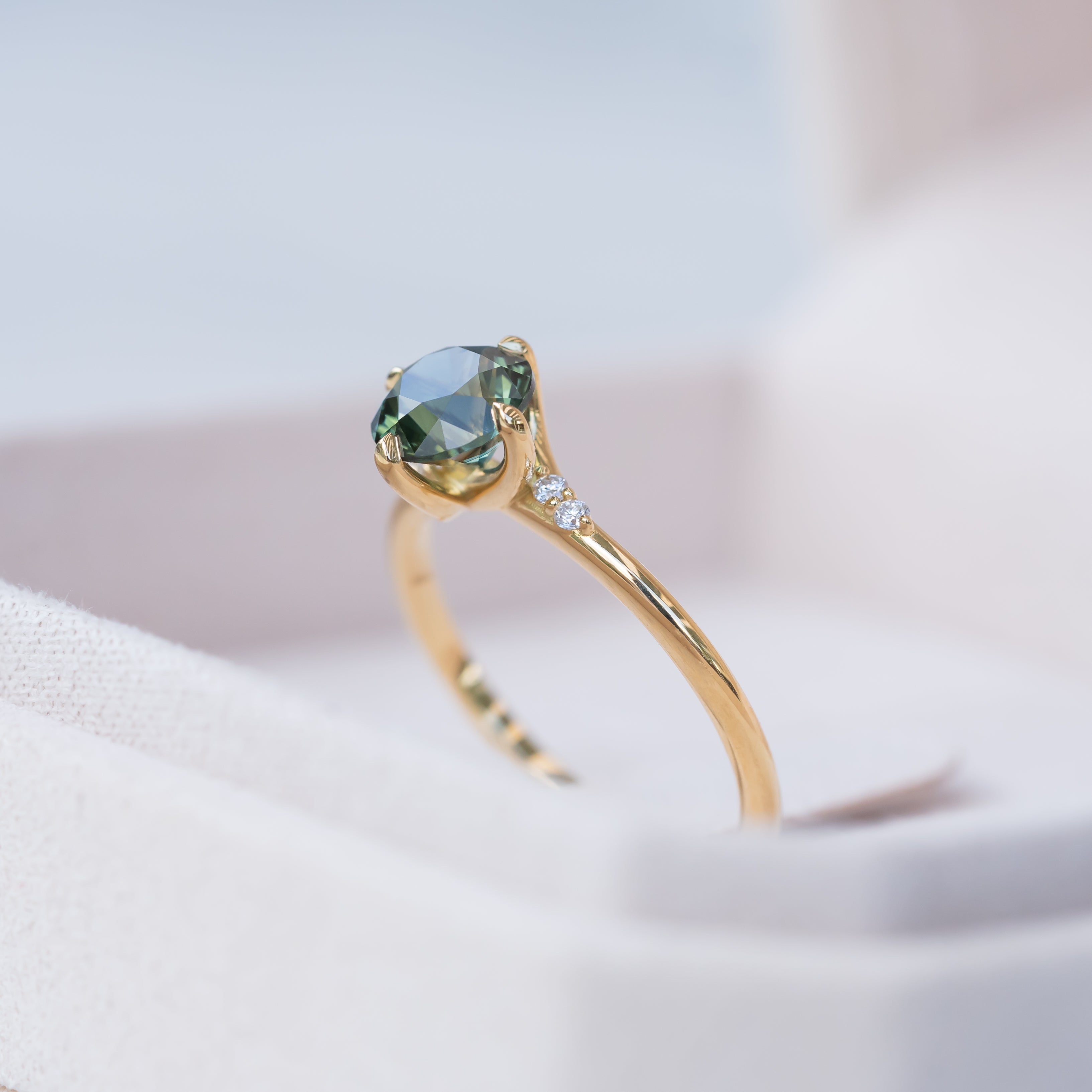 Gemstones: One 1.39ct (6.5mm) round cut green/yellow untreated Australian sapphire. This sapphire is a gorgeous forest green colour with flashes of yellow and in certain lighting conditions slight flashes of blue/teal. The sapphire is flawlessly precision cut and displays beautiful fire and brilliance